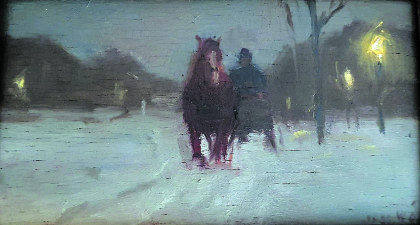 Azt a szépséget, amelynek bevezetőmben említett „feltámadására” – vagy legalábbis csodaszámba menő gyógyulására – soha nem kerülhetett volna sor Szutor Katalin, a Magyar Nemzeti Galéria főrestaurátora, s ugyanakkor gazdag önálló életművű festőművész nélkül, aki az ikonfestés és általában a szakrális témájú képek jelentékeny alkotója. Ő – évtizedekkel ezelőtt – hosszan, elmélyülten dolgozott ezen a legfeljebb jókora férfitenyér nagyságú, töredezett kis képen, míg az Oskó Lajos-életmű e kevéssé számontartott darabja egyszer csak ismét sugározni kezdett a maga fátyolosan barbizonias módján. S amikor ebben az új életre kelt formájában először megpillantottam, egyetlen perc alatt ötéves kislányként néztem ki újra régi pécsi otthonunk ablakán, amely szülővárosom egyik főútvonalára, a Rákóczi útra nyílt. S amit láttam, ugyanaz volt: egylovas szánkó, puha árnyak és kicsi meleg fények, az advent megannyi ígérete. Szinte várom, hogy ezekben a nagyvárosokban rég szánja sincs, szekere sincs időkben becsönget az ajtón egy régi barátunk, Monspart Laci bácsi, a gyerekek és a lovak jószívű, játékos barátja, s puha takarók alatt, babzsákok védelmében elvisz bennünket a Mecsekre, egy igazi, nagybetűs Adventi Kirándulásra. Orosháza, Budapest, Párizs, Pécs… Messzire jutottunk, de ezekkel a szánkázó szavakkal most nem Oskó Lajos pályaívét akartam megrajzolni. Inkább jelzés ez a pár sor, mely arról tanúskodik, hogy teljes hittel hiszem: a lelkeket is megérintő értékek soha nem veszhetnek el. S míg vannak a világban ilyen értékek és Szutor Katalinhoz hasonlóan elszánt értékmentők, addig senkit ne riasszon a szegény karácsony. Mert ilyen nincs. A születés ünnepe önmagában is maga a gazdagság, amelyhez ki-ki hozzáteheti a maga kis értékmentő, sőt házi „restaurálásokra”, kedves és fontos régi tárgyainak javítgatására kész szeretetét. De vigyázat, a festményeket bízzuk avatott kezekre!