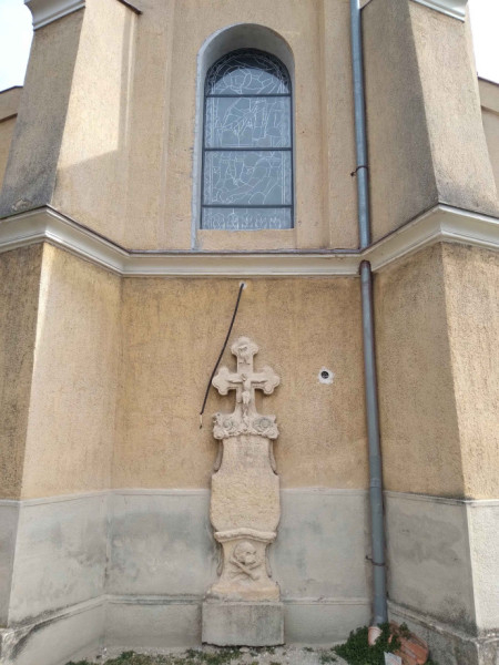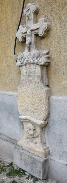 A sírkő lábszárcsontokra helyezett koponyával ellátott kis lábazata, a feliratos lant alakú középrész és a volutás növénydíszes párkány felett emelkedő feszület egy tömbből faragott. A lábazat és a feliratos mező felső része ívelt oldalú, törtívű párkány zárja. Ezekről oldalt egy-egy, eredetileg szabadon lévő füzér függ. A sírkő ma a templom hátfalába építve, a körítőfal lábazatának kiugrásán áll, oldalát részben a homlokzati vakolat fedi. A faragvány anyaga puha, sárgás homokkő. Az időjárásnak kitett, mállékony faragvány feliratának a felső részén ma már épp csak kivehető Hajas István veszprémi plébános neve.