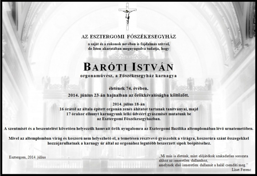 A főszékesegyház Baróti Istvánt saját halottjának tekinti, temetéséről a hozzátartozókkal egyetértésben később intézkednek.