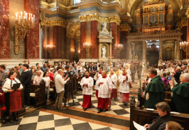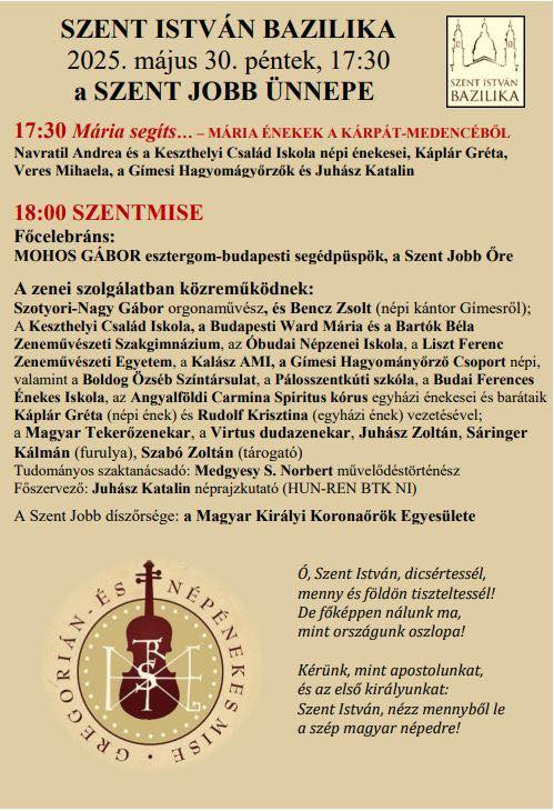 A budapesti Szent István-bazilika kisbúcsúját hagyományosan ének- és zeneszóval, gregorián- és népénekes „folkmisével” ünneplik az esztergomi főszékesegyház társbazilikájában.