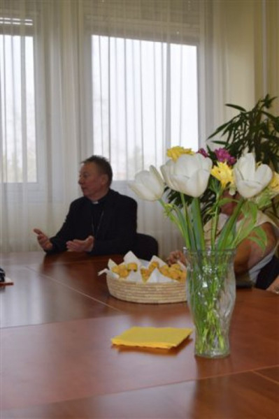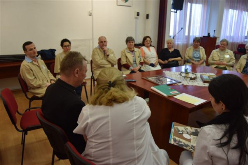 Az áhítat végén Faragó Artúr, valamint a kórházlelkészi szolgálat lelkigondozói és önkéntesei a kórház Flór Ferenc termében fényképes előadásban számoltak be munkájukról a megyéspüspöknek.