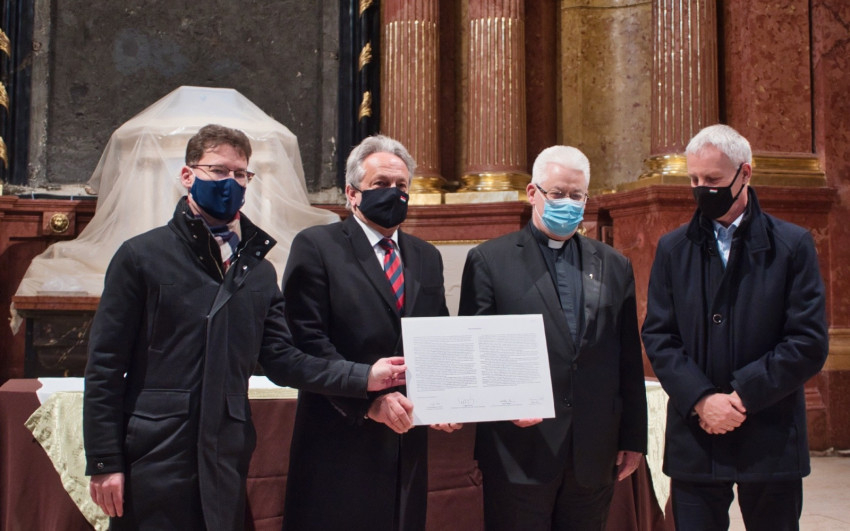 A köszöntők után került sor az időkapszulába készült dokumentum aláírására, amely a bazilikában végzett munkálatok előzményeiről és a renoválás eredményeiről szól. „A székesegyház belső felújítása Isten dicsőségére befejezéséhez közelít. 2022 februárjára elkészült 2000 négyzetméter falkép tisztítása és konzerválása, közel 1800 négyzetméter freskó esztétikai helyreállítása, közel 1500 négyzetméter műmárvány és stukkó felület, valamint a főoltárképpel együtt 66 négyzetméter vászonkép restaurálása. Elkészült a szószék helyreállítása, az altemplomban 136 sírtábla restaurálása. Az összes fából készült barokk szobor és az oltárképek kereteinek restaurálása is megtörtént.”