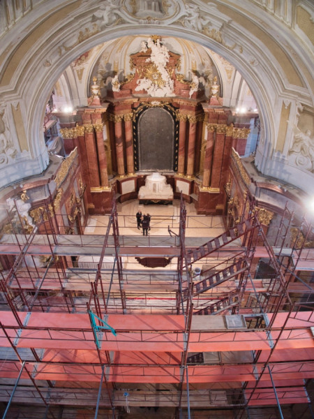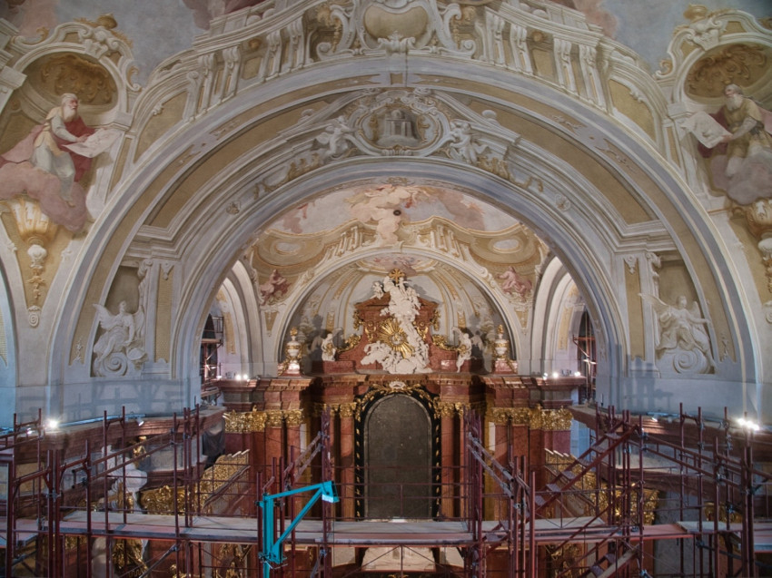 Jeszeniczky Ildikó Munkácsy-díjas festő-restaurátor művész, vezető restaurátor egy négy évvel előtti felvételen mutatta meg a templombelsőt, amelyen látszottak a sok szennyeződéstől, átfestésektől súlyos, sötéten elnehezült boltozatok, a beázásfoltokkal veszélyeztetett vakolatlehullások. Az oltárkép besötétedett, megbarnult a lakkrétege, alig volt látható a színvilág, és az aranyozott felületek szennyezettek voltak. A művésznő egy freskórészleten mutatta be, milyen hatalmas munkán vannak túl a szakemberek. „Valóban hétről hétre újabb és újabb elem kerül vissza, a műtárgyak többsége már restaurált állapotban várja az ütemterv szerinti visszaépítést. Ahogyan várják már a mellékoltárképek, predellaképek, táblaképek is, amelyek ismét ragyogó színükben pompáznak.”
