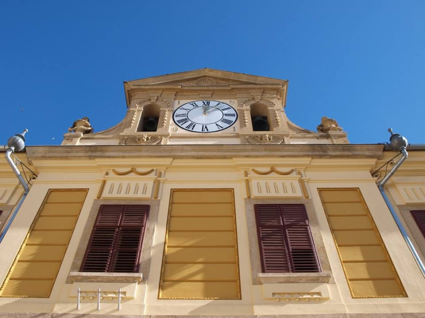 A levéltári épület főbejárata feletti harangfülkés oromzat, amelynek helyén korábban egyszerű timpanon volt, 1891-ben, a pécsi székesegyház átépítésének utolsó évében készült. A Pollack Mihály tervei alapján a 19. század első felében átépített székesegyház mind a négy tornyán fekete színű, arany számjegyes óralapok voltak, amelyek a későbbi, 1882 és 1891 között zajló felújításkor lekerültek. Az óralapok közül egyet megőriztek, s a levéltári épület oromzatán helyezték el. A most leszerelt óralap nem 1891-ben került fel: azóta azt már többször kicserélték, legutóbb az 1960-as években.