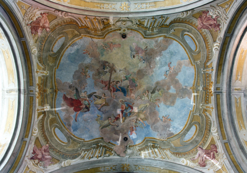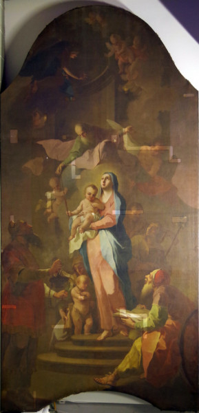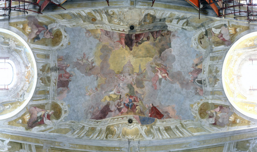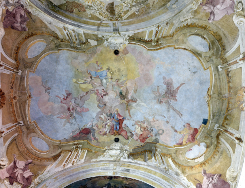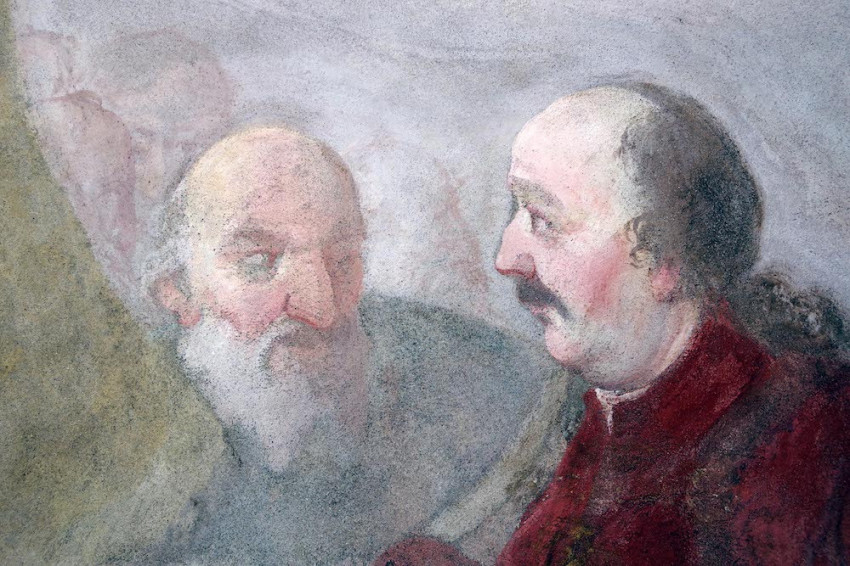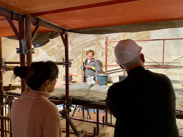 Jeszeniczky Ildikó a mennyezetképek tisztításának izgalmas részleteibe avatta be az érdeklődőket. Az átfestések alatt néhol váratlan részletek bukkantak elő: egy-egy fej „más irányba fordult”, több eszköz „eltűnt”, míg mások – jellemzően a kortárs adományozó nemeseket ábrázoló alakok kezében tartott pénzérmék – előbukkantak a későbbi festékrétegek alól. Elhangzott, hogy a templom díszítőfestéssel dekorált felületein összesen 360 ezer pöttyöt kell újraaranyozni a restaurátoroknak.