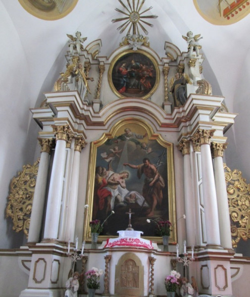 A templom műértékei között kiemelkedő helyet foglal el a három oltár. A Jézus megkeresztelkedését ábrázoló főoltár felső részén a művészettörténeti ritkaságnak számító medálon látható Mária és József eljegyzése. Az egyik mellékoltár a népét, országát és koronáját a Szűzanyának felajánló Szent Istvánt ábrázolja, a másikon Mária, a világ Királynője látható. Híresek a szószék képei, különösen a magvető székely. Említésre méltó a templommal egyidős keresztkút, a templomnál régebbi gótikus kőablak, az eredeti állapotába visszaállított Kolonics-orgona. A hajó, a szentély és a kórus festményei újabb keletűek, a második világháború előtt készültek. A képek közül a legrégebbi Szent Erzsébetet ábrázolja, hátterében látható a templom támogatója és a hegyen lévő kápolnát építtető Gáborffy család egyik tagja.
