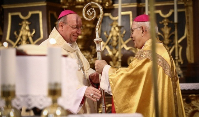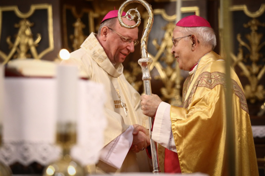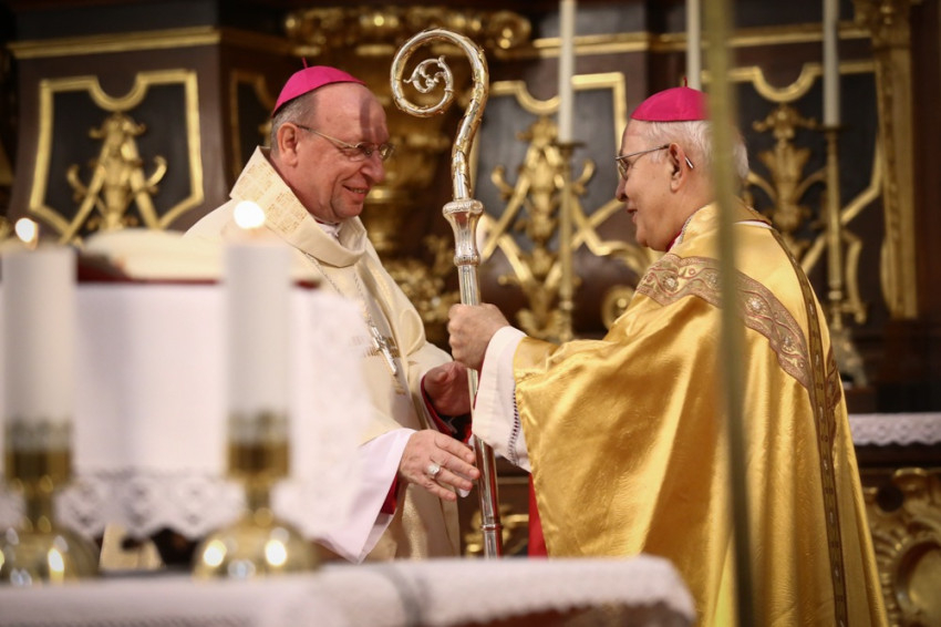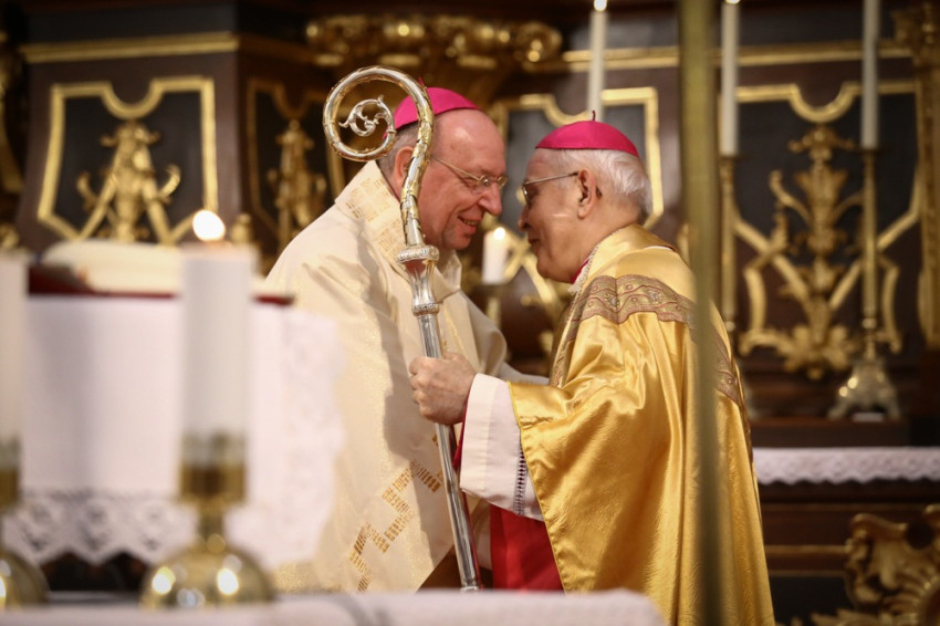Bosák Nándor elmondta, hogy az egyházmegye felnőtté lett ugyan ez idő alatt, ám mégis csupán egy félig kész egyházmegyét tud átadni utódjának, hiszen megannyi feladat és teendő várat még magára. Ehhez kéri az új főpásztor elkötelezett munkáját és azt, hogy legyen jó pásztora rábízott híveinek és papságának. Ezt követően jelképesen átadta Palánki Ferencnek a pásztorbotot, s ezzel az egyházmegye vezetését is, emlékeztetve őt, hogy fogadja azzal a bizalommal és készséggel, amivel annak idején elfogadta a papi hivatást, és odaadta életét Isten és az emberek szolgálatára.