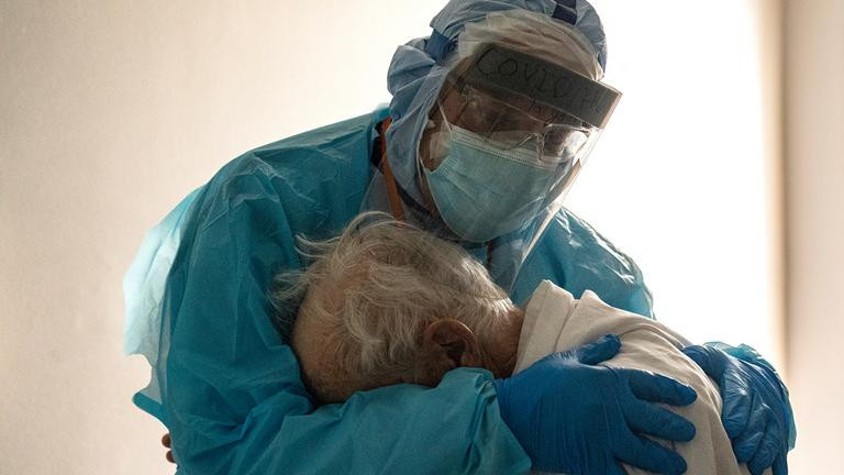 A Getty fotóügynökség egyik munkatársa elkapta a megindító pillanatot; képe pedig villámgyorsan bejárta az internetet; tökéletesen megörökíti sok koronavírusos beteg és az őket ápoló egészségügyisek érzéseit. Mély emberségről tanúskodik, ahogy az orvos átöleli az idős embert, és próbálja pótolni a család és a barátok hiányát.