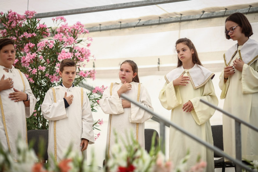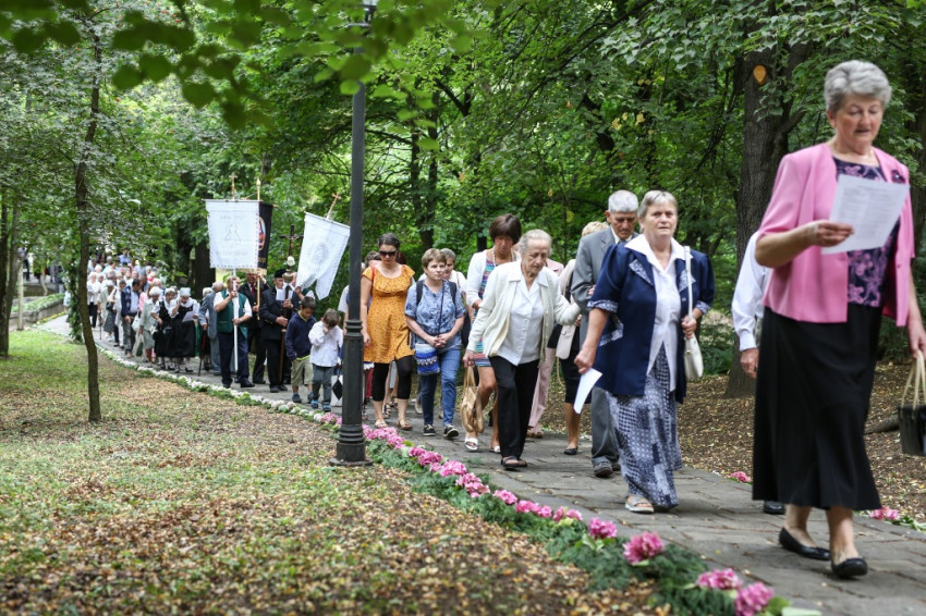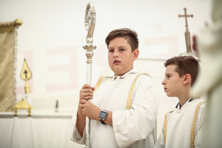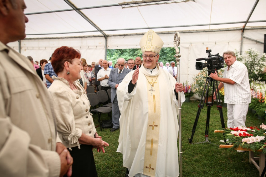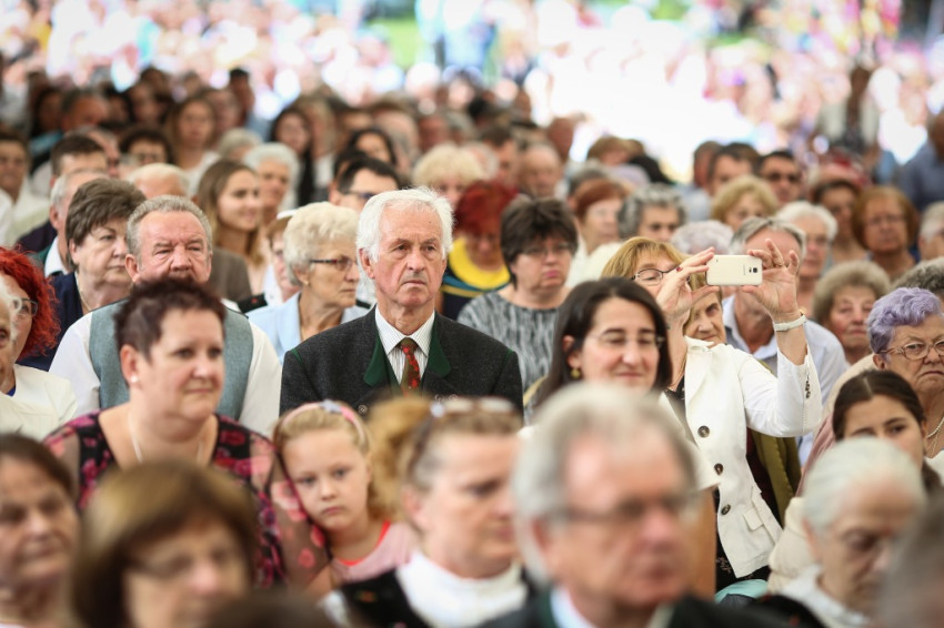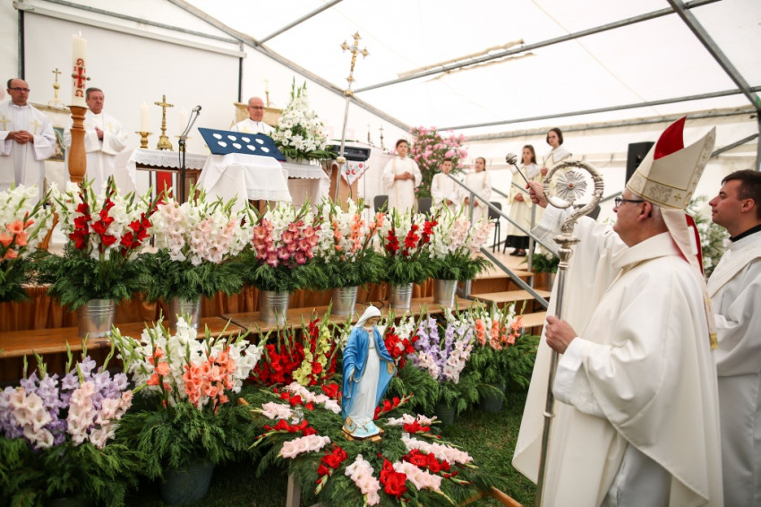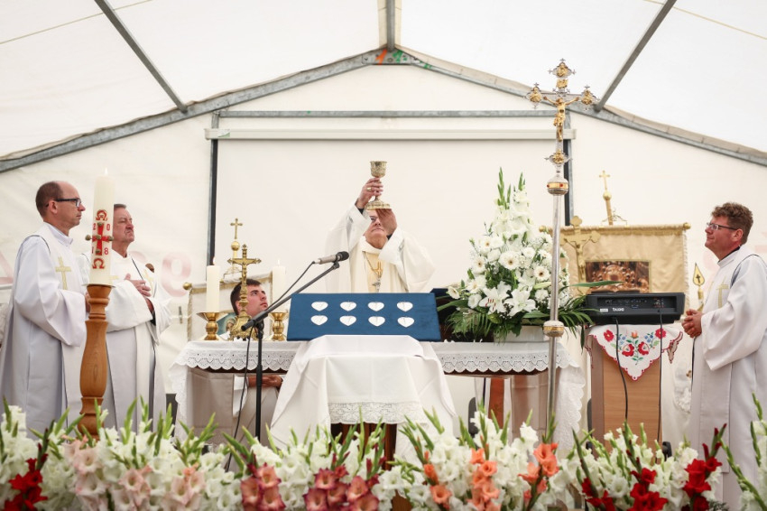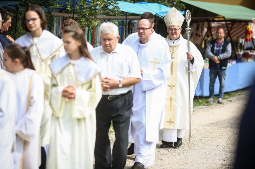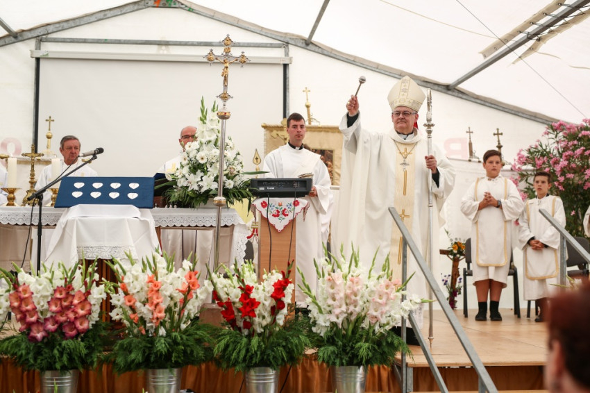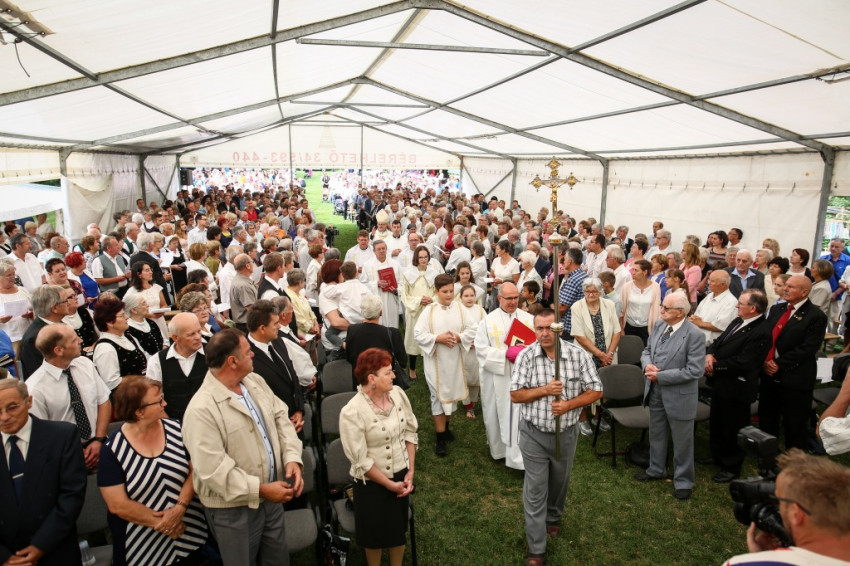 Miközben megtelik a belső tér, megtelnek a sátor mögött és mellett felállított padsorok, a megyés főpásztor még imára térdel a templomban a kegykép előtt. A sátorban zeng az ének, ünnepi díszbe öltözött már a lélek. A szentmise főcelebránsa és szónoka Spányi Antal püspök, koncelebrálnak a híveiket kísérő paptestvérek.