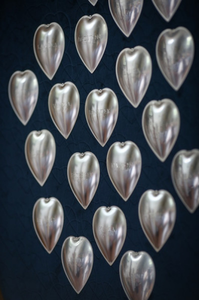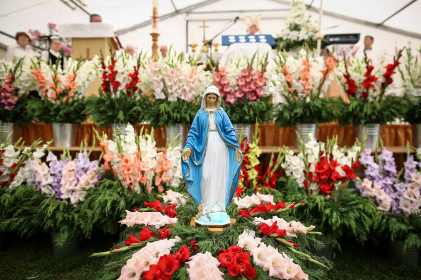 A somlóiak több napja készültek az ünnepre. A vendégeket süteménnyel fogadják a fehér virágokkal ékesített betlehemi házban gyülekezve. Egyre többen vannak, Spányi Antal megyéspüspököt várják. Fél tízkor a búcsúsok menetbe rendeződnek, és megindulnak a kegytemplomhoz. A főutcán vezet az út. Rendezett, virágos udvarok mindenütt, szépen lekaszált rézsűk. Vannak itt házak a múlt századból, sok a Kádár-korszakban épített ház, de a hetvenes években elindult gyarapodás emeletes otthonait is megtaláljuk. Valami mindenütt közös: a gondozottság és a rend. A falut elhagyva az út a dombok közé vezet, kanyarog a szelíd lankák között. Énekelve vonul menet, Spányi Antal vezetésével. Az utolsó kanyar előtt a főpásztor megáll. Fohászt mond a díszkapu előtt, a menet imával lép be Mária kertjébe. Mindenütt virág, így jutunk el a kegytemplom előtti füves téren felállított fehér óriássátorhoz. Belépve válik igazán kézzel foghatóvá, mit jelent ennek a faluközösségnek a búcsú: több száz szál kardvirág díszíti az oltárt, körbevéve Mária szobrát. Az oltár előtt kék bársonyon nyolc ezüstszív. A hálaszívek. Tavaly, az első alkalommal tizenkét szív készült és került a kegytemplom falára, ahogy egykor a fogadalmi táblákat helyezték el a búcsúsok.
