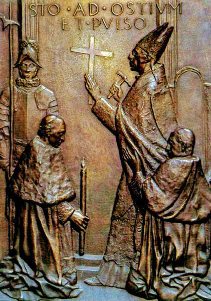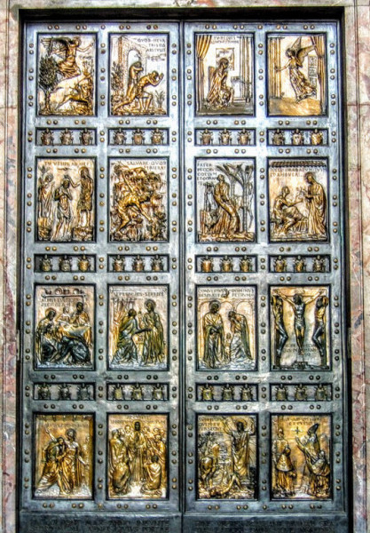 A Szent Péter-bazilika szent kapujának központi részén, a következő szentírási jelenetek láthatók (a tizenhat osztatú kapu második és harmadik sora):