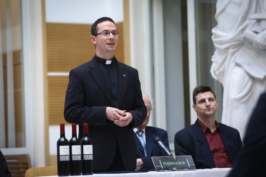 Röviden ismertette, milyen fontos szerepet játszott a piarista rend életében a borászkodás. A rend magyarországi megtelepedésével egy időben megindult a borászat, az 1800-as években pedig már palackozták is a szerzetesek boraikat. Ezt törte derékba 1945: a kommunista rendszer felszámolta a nagybirtokokat, s megszüntette a piarista borászatot is. A rendszerváltáskor a rend ezt nem tudta folytatni, de nem is akarta, így született meg a gondolat, hogy a borászatok versenyén jöjjön létre a piarista bor.
