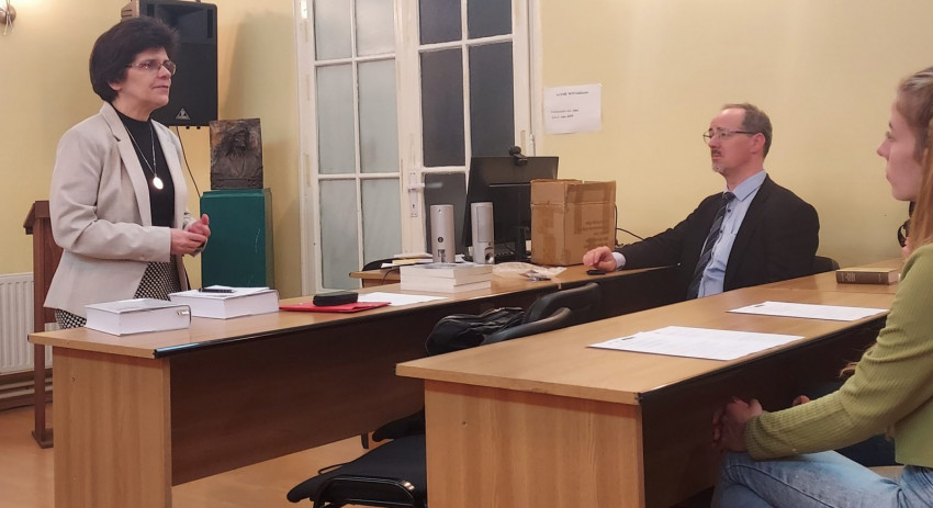 A kötetek bemutatása után a munkacsoport tagját, Medgyesy S. Norbertet Egyed Emese kérdezte az iskoladrámák kutatásáról, az eziránt kibontakozó érdeklődése eredetéről és a Pázmány Péter Katolikus Egyetemen végzett tanári munkája mellett saját kutatási területeiről, amelyek a népi vallásosságra, a liturgikus ima, ének műfajára vonatkoznak. Egy témájába lendületesen belemerülő, elkötelezett és sokoldalú, rendkívül felkészült tanárt, kutatót láthatott – nem először – a kolozsvári közönség, akinek munkája egy másik vonatkozását, a színi direktorságát is megismerhetik pénteken, október 21-én, amikor az általa színre vitt és diákjai által előadott színielőadásra sor kerül, és az érdeklődők tanúi lehetnek annak, hogy a több száz éves iskoladráma-szöveg hogyan szólal meg mai diákok ajkán, és hogyan válik élővé ma is.