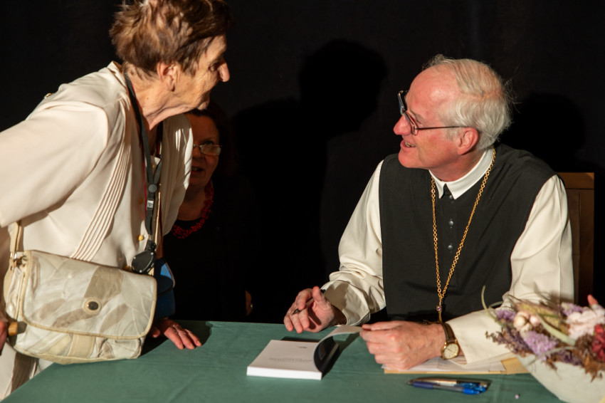 „Különleges megtiszteltetés itt lenni, bárcsak jelen lehetne velünk a két szerző is” – kezdte köszöntőjét Peter Verhalen OCist, a Dallasi Miasszonyunk Ciszterci Monostor apátja, a Zirci Kongregáció prézes apátja. Kristóf atya sajnos már nincs közöttünk, Gyula atya viszont az internet segítségével most is követi Dallasból az eseményeket. A Minden kegyelem című könyvben Gyula atya idegenvezetőként kalauzol bennünket a történelem útján, azt meséli el, hogy miként jutott el Győrből indulva Rómán át egészen az amerikai Dallasig. Sajátos humorral, öniróniától sem mentesen ír gyermek- és fiatalkoráról. Megemlíti azokat a hős férfiakat, akik az ötvenes években – amikor egy ciszter szerzetes csak a „föld alatt” létezhetett – meghatározóak voltak számára is. Gyula atya nem rejti véka alá azokat a nehézségeket sem, melyekkel az Egyesült Államokban meg kellett küzdenie a közösség és az iskola létrehozásában, megerősítésében.