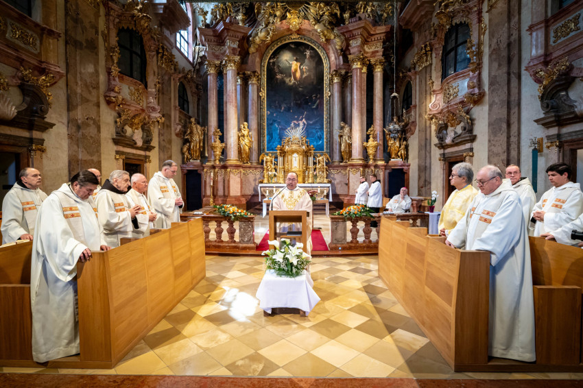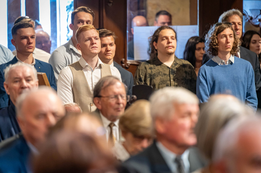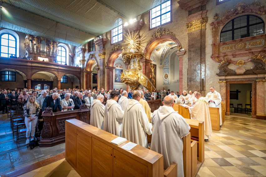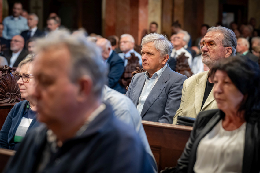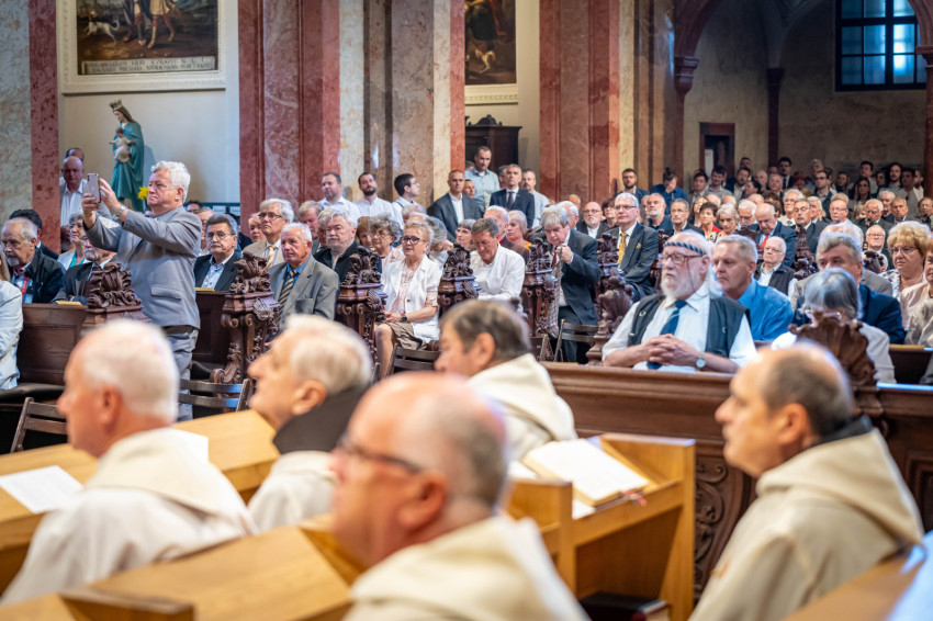 Zsúfolásig megtelt a jezsuitáktól örökölt, szépen megújuló Loyolai Szent Ignác bencés templom. Jó volt látni, hogy az ülőhelyek az idősebbeknek voltak fenntartva, a fiatalabb nemzedékek tagjai pedig oldalt és hátul álltak. A padokon, székeken – mint Teodóz atya idejében – Kelemen Áron atya gondosan szerkesztett miseének-sillabusza várt bennünket. Az elhunyt tanárainkért és diáktársainkért bemutatott szentmise főcelebránsa Sárai-Szabó Kelemen perjel, a gimnáziumot fenntartó Szent Mór Perjelség elöljárója volt.