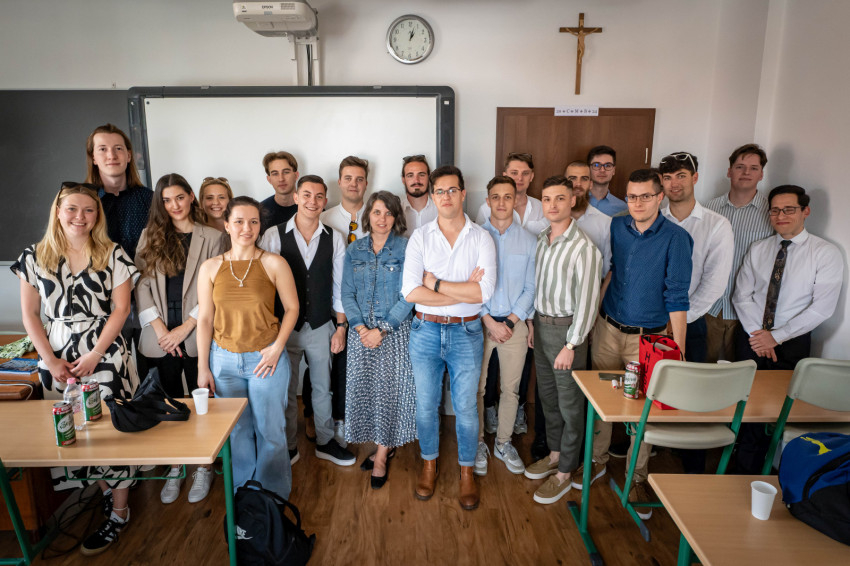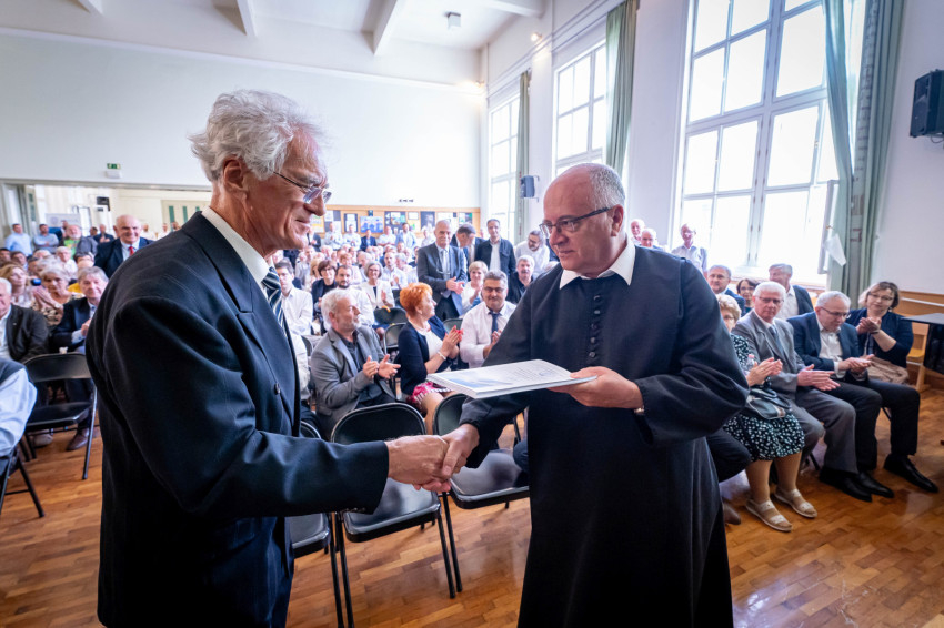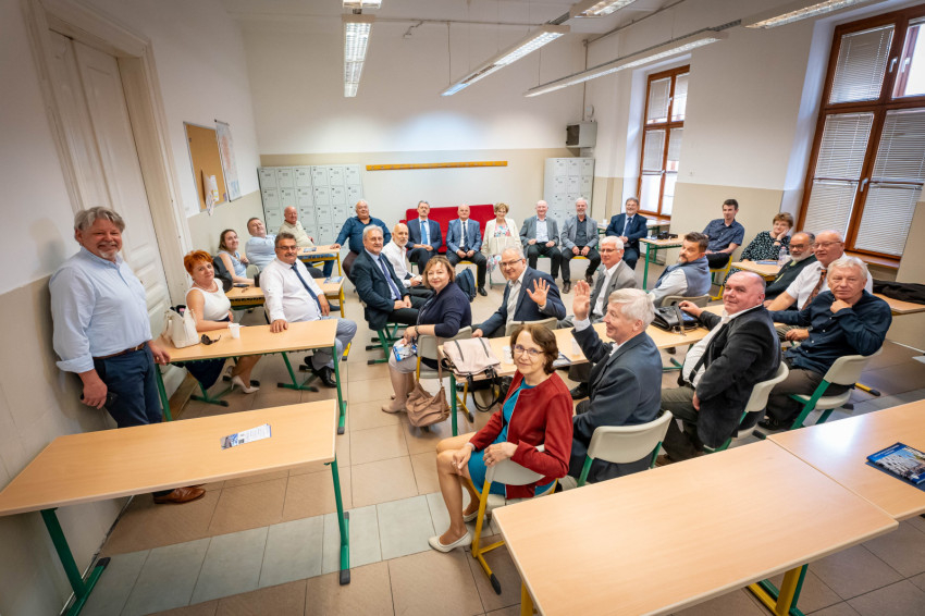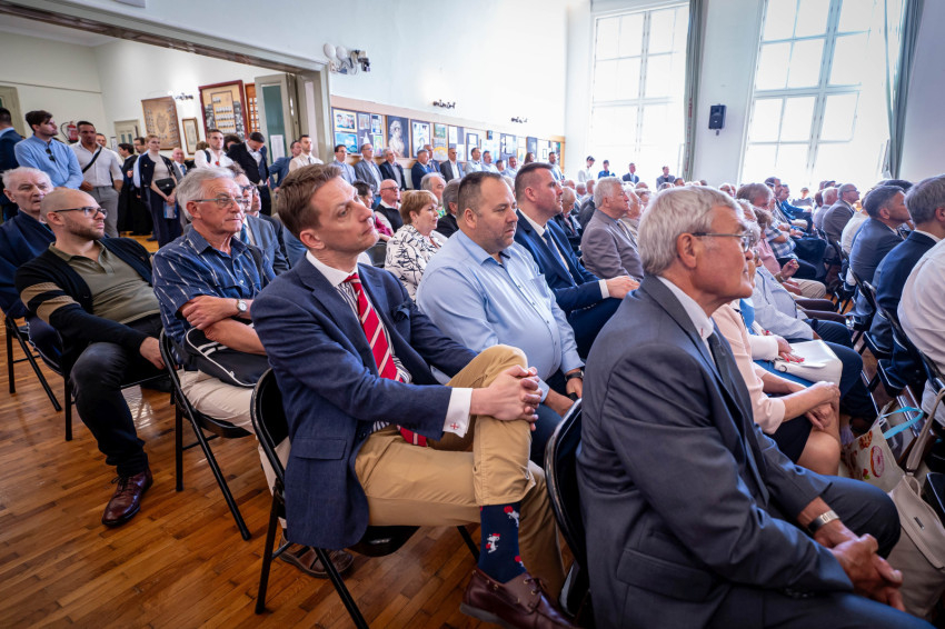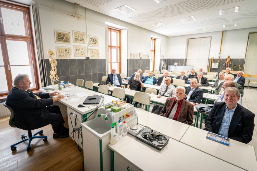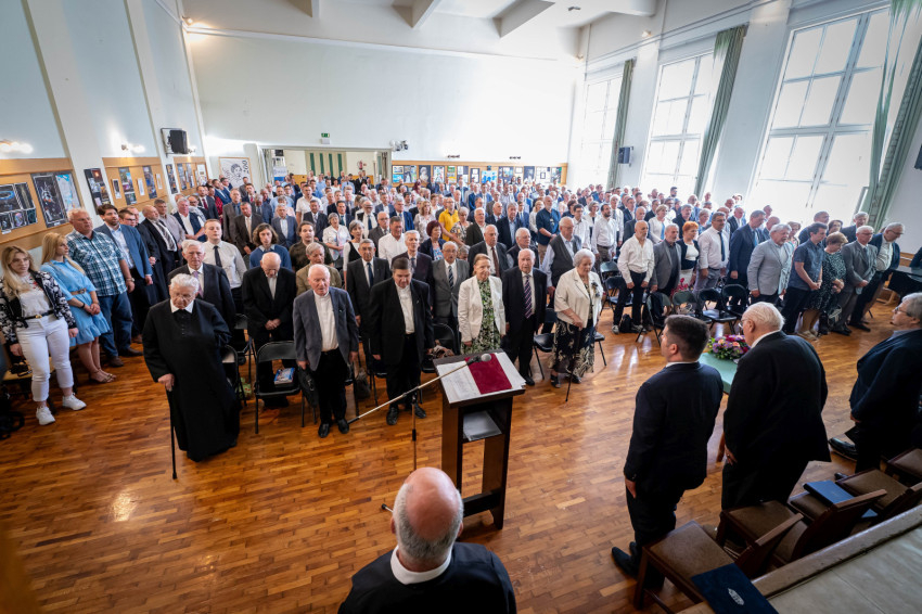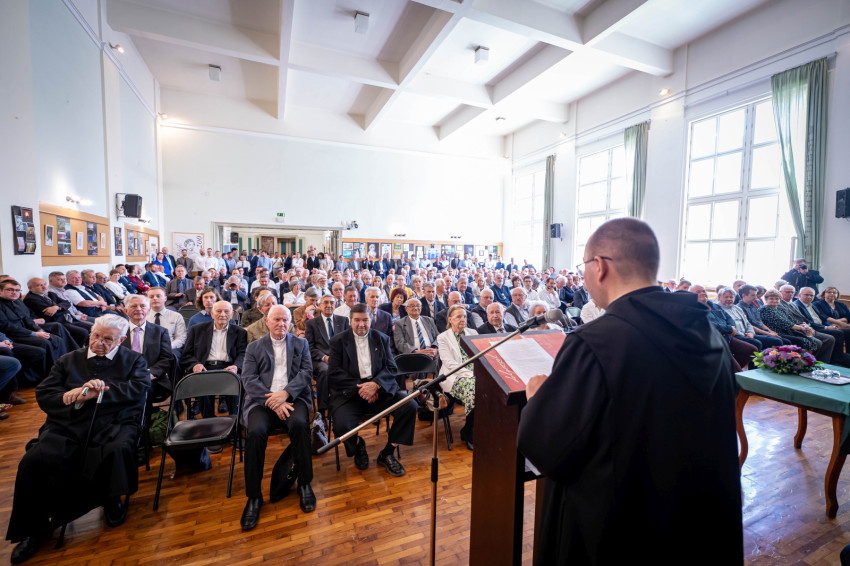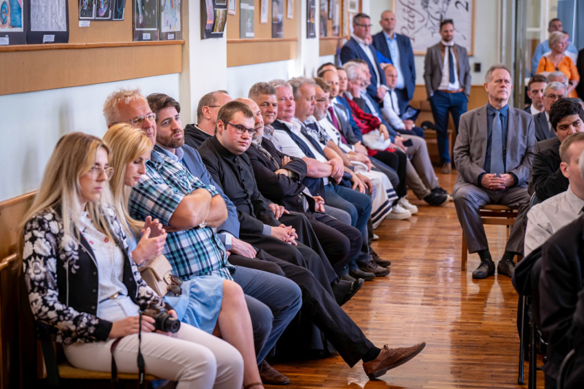 A bencés templomból a gimnáziumba átvonulva, a díszteremben folytatódott az ünneplés. Nyitányként a Himnuszt énekeltük. Sárai-Szabó Kelemen győri perjel és Tóth Konstantin igazgató köszöntötte a jelenlévőket. Lényeglátó áttekintést adtak iskolánk küzdelmes történetéről, jelenlegi eredményeiről, az öregdiákok részére szervezett sokféle programról. (Részletes iskolatörténeti ismertetés olvasható tőlük a Czuczor Gergely Bencés Gimnázium és Kollégium 2022/2023-as, elegáns kivitelű, képes-szöveges évkönyvében.) A 2026-ban már négyszáz éves győri oktatási intézménynek, hathatós kormánytámogatással, nemcsak az épületei újulnak meg, hanem a korigény figyelembevételével bennük az oktatás, nevelés is megújul – az óvodától az érettségiig. Mintegy 1200 diák tartozik a bencések által irányított győri bencés családhoz.