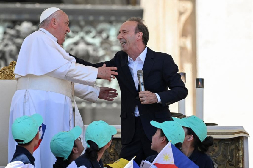 „Szeressétek, amit csináltok, ne elégedjetek meg azzal, hogy jó munkát végeztek, hanem a legjobb tudásotok szerint végezzétek el, ahogyan Michelangelo megalkotta ezt a kupolát” – mondta Benigni és megismételte II. János Pál felhívását: „Ne féljetek!” „Mindannyian együtt vagyunk, a szívetekben az egész emberiség lüktet, egyek vagyunk. Látom, hogy készen álltok arra, hogy szárnyra kapjatok, hát tegyétek meg!