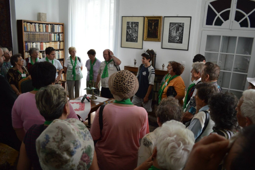 Az ebédet ezúttal is a Segítő Nővérek Szent Margitról elnevezett házában fogyasztották el a zarándokok. A ház ugyan Áron püspök halála után, de az ő óhajának köszönhetően épült fel. Kovács Gergely atya meglepetésként itt adta át a májusban viceposztulátorrá kinevezett és a zarándoklatokhoz első ízben csatlakozó Kasza László atyának a szentszéki képzést és sikeres vizsgát tanúsító oklevelet. Ezután Darvas Piroska nővér nyújtott betekintést a szerzetesrend és személyes hivatásának történetébe.