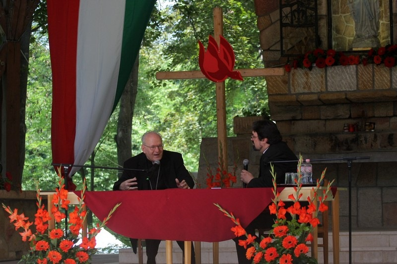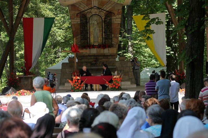 A máriaremetei kegytemplom szabadtéri oltárnál Kunszabó Zoltán állandó diakónus folytatott kötetlen beszélgetést Erdő Péter bíborossal. A főpásztor az izraeli és palesztin elnökök nagyon rövid időn belül létrejött vatikáni imatalálkozójáról beszélt azzal kapcsolatban, hogy a pünkösd a meglepetések ideje. A bíboros szerint az volt igazán egyedülálló e kezdeményezéssel kapcsolatban, hogy az Apostoli Szentszék államtitkárságán keresztül gyakorlatilag másfél nap alatt megszervezte, hogy a világegyház imája kísérje a találkozót. A technika erre másfél évtizeddel ezelőtt még biztos nem adott volna lehetőséget.