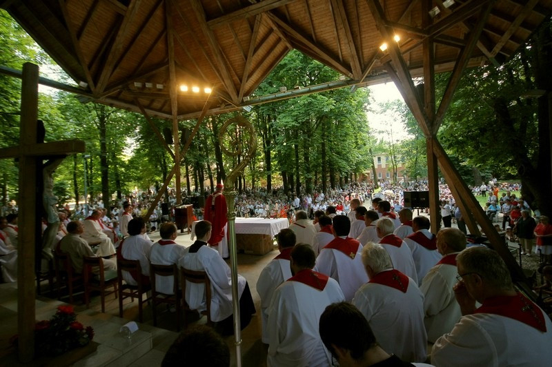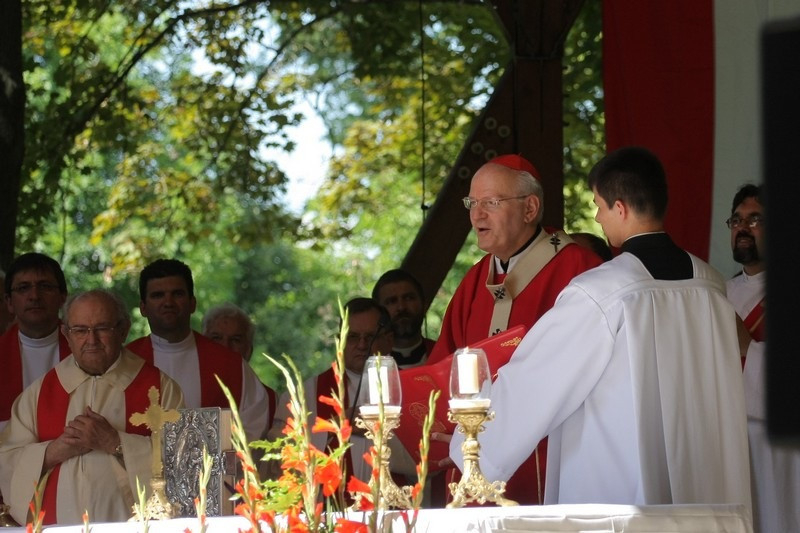 A beszélgetést követően kezdetét vette a szentmise a szabadtéri oltárnál, melynek főcelebránsa Erdő Péter bíboros volt. A Szent Máté szerinti evangélium a nyolc boldogságról szólt (Mt 5,1-12). A főpásztor homíliájában kiemelte: a papság, a szerzetesség és az Egyház iránt elkötelezett világi életformák is – mindannyian a boldogságot keressük, és ezt akarjuk sugározni magunk körül a világban. Jézus erkölcsi tanítását éppen azért kell megtartanunk, hogy boldogok lehessünk. Minden embernek ez a célja és a hivatása, ezért alkotta Isten az embert.