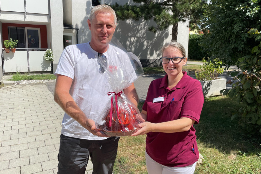 Balázsi János műszaki csoportvezető a zalaapáti Gondviselés Háza nevében ajándékot adott át a neufeldi idősek otthonának, amelyet Völker Judit, a Samariterbund Burgenland munkatársa vett át.