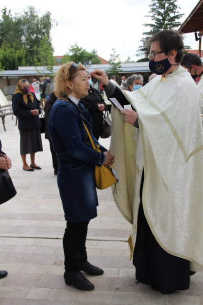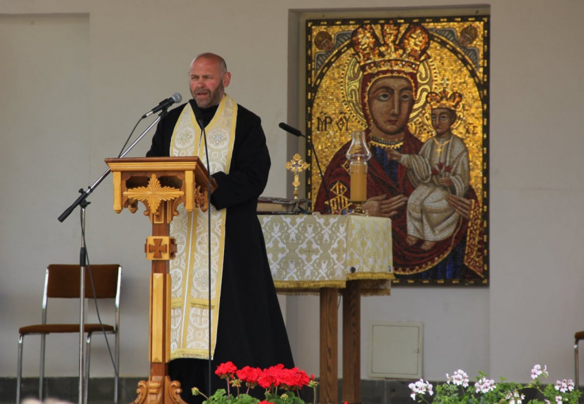 A délelőtti szertartásokat, az utrenyét, majd a két Szent Liturgiát és katekéziseket a kegytemplom belső udvarának tábori oltáránál végezték.