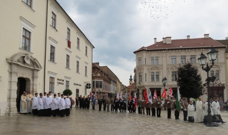 Díszmenetben, történelmi zászlókkal vonultak be a templomba, majd a mellékoltároknál és a főoltárnál is díszőrséget álltak a megjelent hagyományőrző határőrök és honvédek.