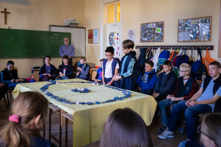 A hatodik osztályosok a termük közepén elhelyezett asztalt ülték körül. Náluk az általuk farmer anyagból készített virágok helyettesítették a rózsafüzér egyes szemeit. Az imákat tizedről tizedre világító mécsessel számolták, amelyeket a kettesével előimádkozó gyerekek helyeztek el.