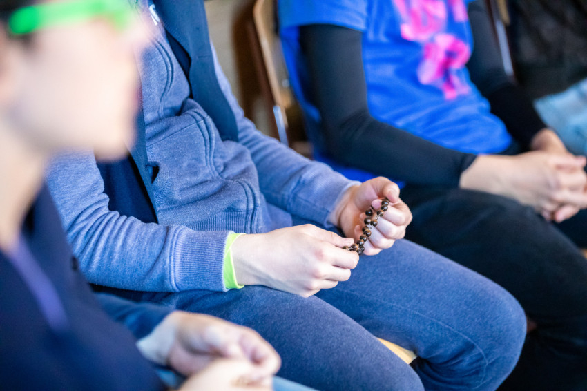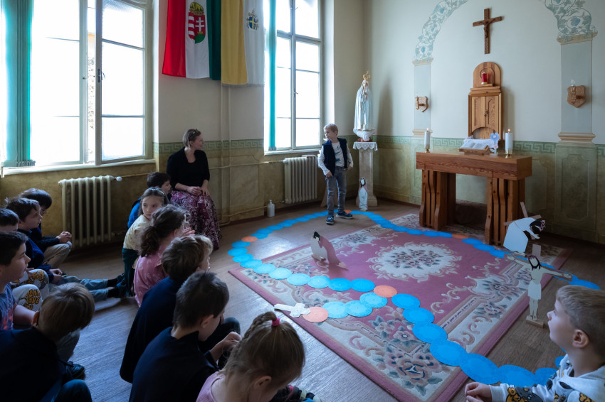 Most épp a második osztályosok gyűltek össze a kápolnában és a hittant tanító tanárnővel együtt, kis térdeplőkön ülve mondták közösen az imát. A számolásban kis aranypapírból kivágott csillagok segítették a gyerekeket – minden előimádkozó egy-egy kis csillagot helyezett a füzérszemekre. Péntek lévén a fájdalmas rózsafüzér titkait mondták, amelyeket –a kicsik számára könnyebb elképzelés és befogadás megsegítésére – Jézus alakját ábrázoló papírbábok is jeleztek.