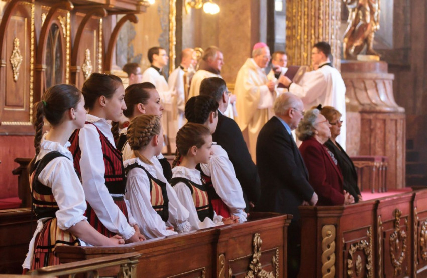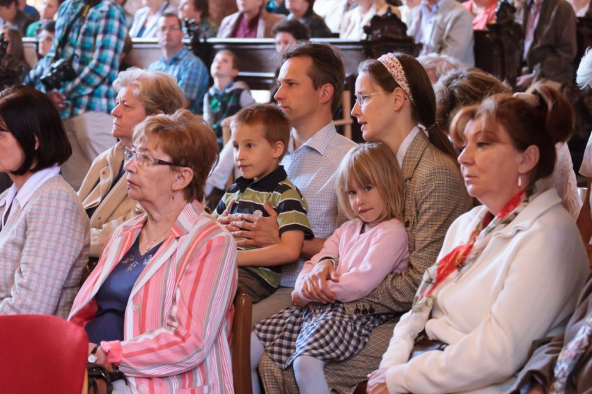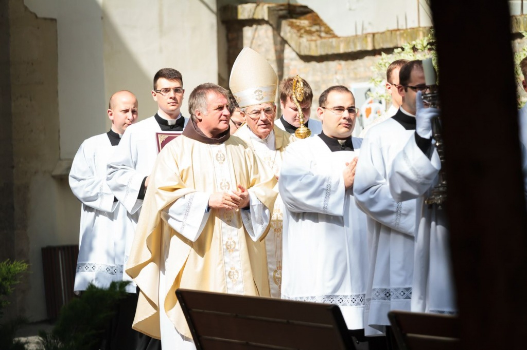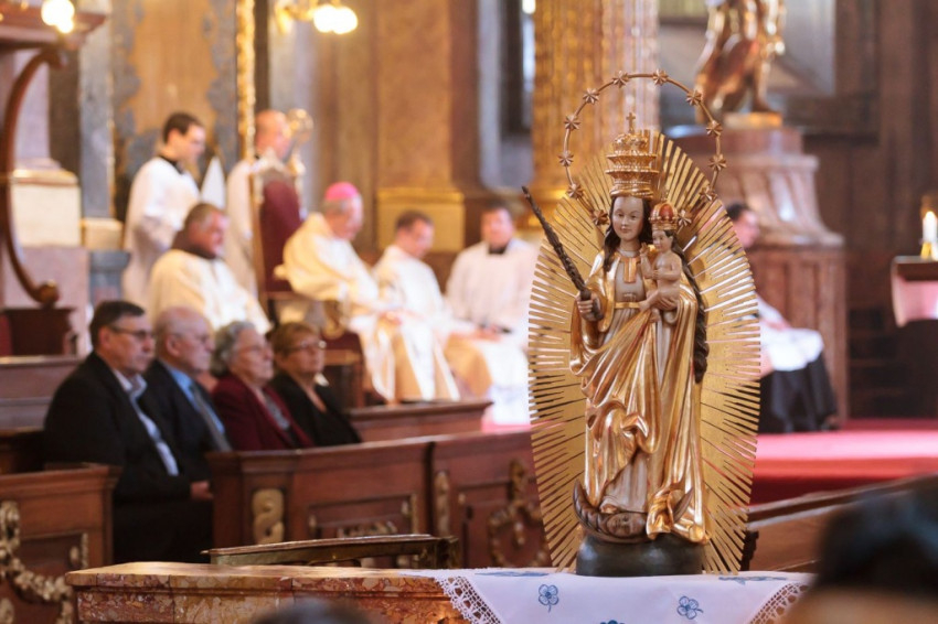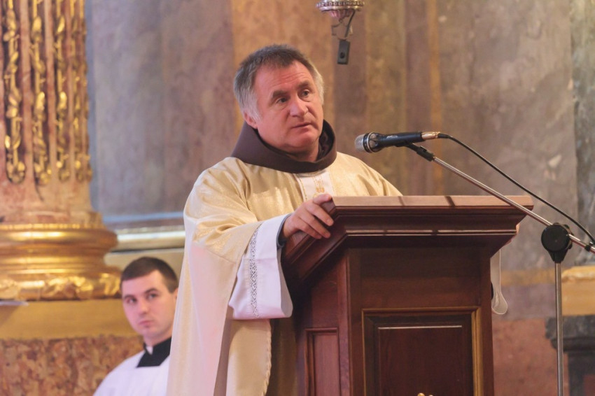Csaba testvér szentbeszédét a csíksomlyói Szűz Mária-szobor ötszáz éves jubileumának felidézésével kezdte, s örömmel adta át a szobormásolatot, amelyet az egyházmegye számára hozott ajándékul. A szónok ezután az egykori török hódítás és a Dózsa-féle parasztfelkelés eseményei kapcsán rámutatott, hogy a csíksomlyói Szűzanya megjelenése Isten válasza volt a földi szörnyűségekre. „A Boldogságos Szűz Mária királynőnk és védelmezőnk lett” – fogalmazott Böjte Csaba. A Magnificatot éneklő Mária örömteliségét hangsúlyozó szerzetes ezután a szent család két fontos tulajdonságára hívta fel hallgatósága figyelmét. Elsőként a bizalom erényét említette: a szálláskeresés előtt Mária és József várhatott volna egy „mennyei GPS-re”, isteni jelre vagy „pályázati kiírásra”, ám ők ehelyett elindultak, bízva Isten segítségében. A szónok hangsúlyozta, hogy manapság annyi mindenre várunk, s feltette a kérdést: Pünkösd küszöbén hívjuk-e a Szentlelket? Mária mert Istenben bízó lélekkel elindulni, s nekünk, Kárpát-medencei magyaroknak is a szeretet mindent felülíró törvénye kell, hogy iránymutatás legyen – hangsúlyozta.