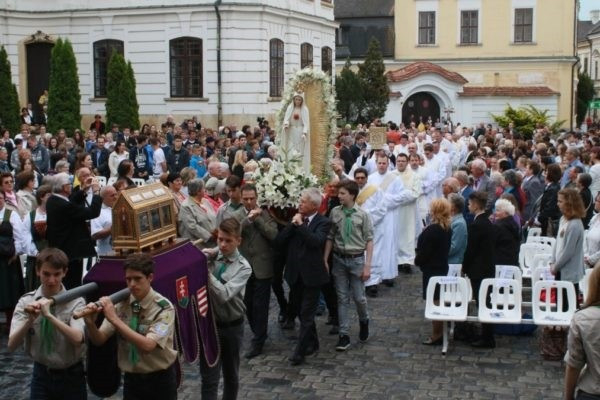 Boldog Gizella ereklyéjét a szentmise idejére díszes körmenetben vitték a Szentháromság téren felállított színpadra – idén a Fatimai Szűzanya szobrával együtt, mivel, mint ismeretes, száz évvel ezelőtt, 1917. május 13-án jelent meg Szűz Mária három kisgyermeknek Fatima közelében.