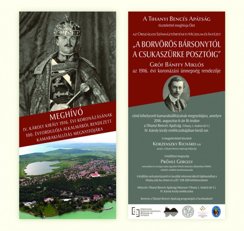 A „Borvörös bársonytól a csukaszürke posztóig” – Gróf Bánffy Miklós, az 1916. évi koronázási ünnepség rendezője című kihelyezett kamarakiállítást augusztus 6-án a Tihanyi Bencés Apátság IV. Károly király emlékszobájában nyitották meg Korzenszky Richárd, az apátság elöljárója részvételével.