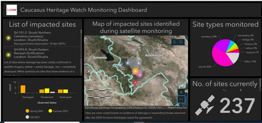 Caroline Cox Twitter-oldalán tette közzé a fenti infografikát, mely a Cornell és a Purdue Egyetem régészeinek együttműködésében zajló kutatás eredményeit jeleníti meg. A Caucasus Heritage Watch (CHW) elnevezésű projekt műholdképek segítségével monitorozza és dokumentálja a veszélyeztetett műemlékeket, történelmi helyeket.