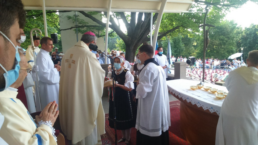 Ezt követi a magyar szentmise, amelyet idén Orosch János nagyszombati érsek mutatott be oltártestvéreivel együtt. A kegytemplom zsúfolásig telve volt a vidékről és távolabbról is érkező zarándokokkal. Voltak, akik a Mária Út zarándokaiként, hagyományosan gyalog zarándokoltak a hegyeken keresztül. Sok kisgyermekes család érkezett. A főpásztor ezt megragadva többek között arra buzdított, hogy ne adjuk fel a hitet és hűen ragaszkodjunk a Szűzanyához: „Sokan közületek kisgyermekkorotok óta hitben különféle búcsújárásokban vesztek részt, és bizonyára szívből teszitek ezt mindmáig, mert megtapasztaltátok a Boldogasszony jóságát, anyai oltalmát. Kérlek benneteket, ezt a tiszteletet, gyermeki ragaszkodásotokat, adjátok át a családjaitokban a következő generációknak is. Mert ahogy Mária Jézushoz vezette elődeinket, úgy minket is Szent Fiához akar vezetni. Szeressük őt, ragaszkodjunk hozzá, őrizzük meg hitünket, ne adjuk fel hagyományainkat, tartsuk meg ami keresztény és magyar!”