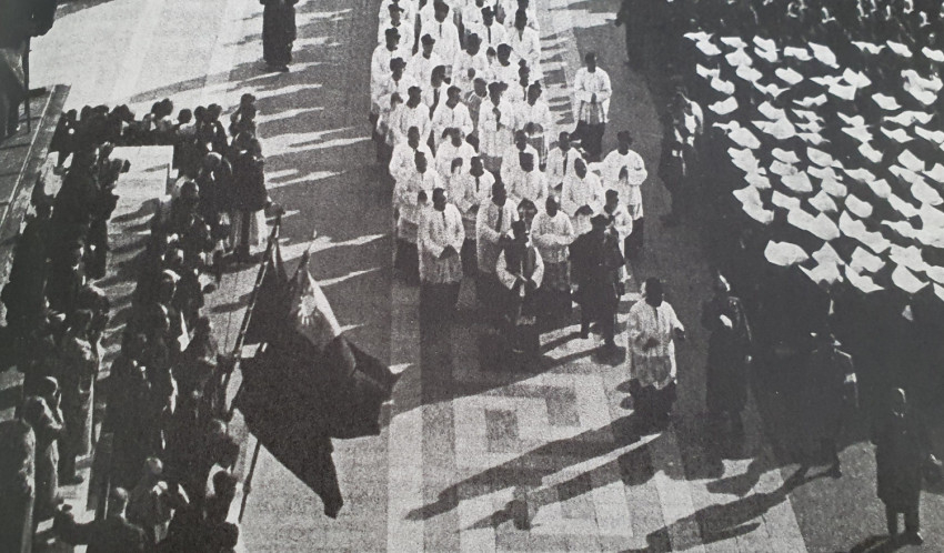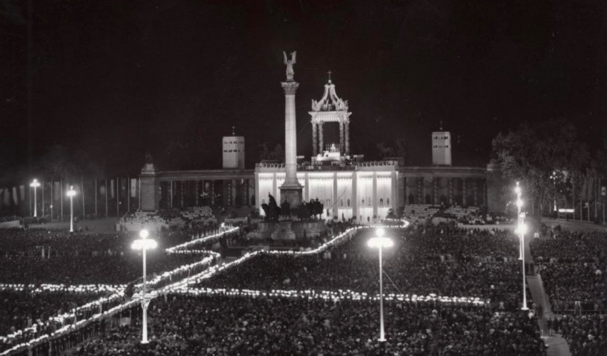 Nyolcvankét évvel ezelőtt késő délután harangszóra indult a papság menete a Vajdahunyad várától a Hősök terére. A fehér karinges kispapok imára kulcsolt kézzel, négyes sorokba rendeződve nyitották az ünneplő klérus felvonulását. A szerzetesrendek, világi papság, kanonokok, apátok, prépostok után 190 püspök és 37 érsek sétált a nyitóünnepség helyszínére. A kardinálisok élén a házigazda Serédi Jusztinián hercegprímás haladt, mögötte a többi bíborossal.