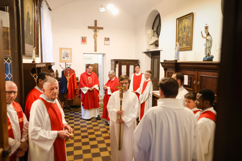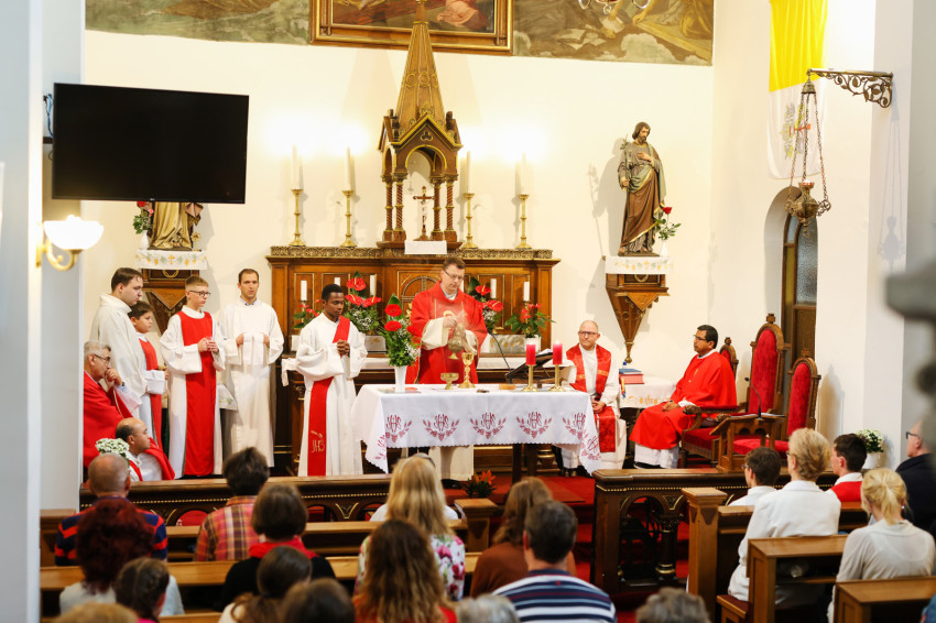 A harangszó után ünnepélyesen bevonult az asszisztencia, a fiatal szerzetesek és a koncelebráló papok: Márkus Zoltán SDB, az Újpest-Clarisseumi Szent István király Plébánia plébániai kormányzója; Hartai Gábor SDB, az Újpest-Megyeri Nagyboldogasszony-templom plébánosa; Horváth Zoltán, az újpesti Egek Királynéja Főplébánia plébánosa; a vietnámi Pham Quoc Thai Hung Savio Domonkos atya Szombathelyről; az indiai Gnana Pragasam Derosi Raja, valamint a nigériai Ilodigwe Emmanuel szalézi diakónus. Andrásfalvy János tartományfőnök papi öltözetére elöl a szalézi vértanú arcképe volt hímezve, hátul pedig a felirat: Boldog Sándor István SDB (1914–1953).