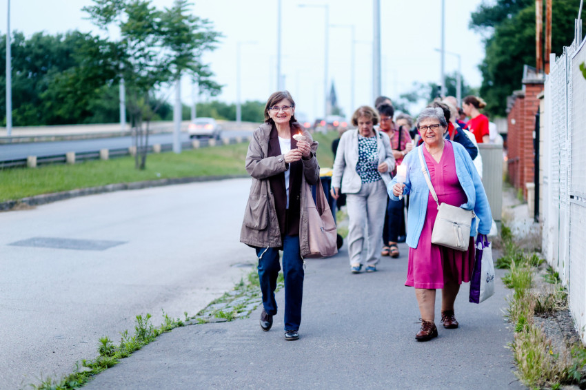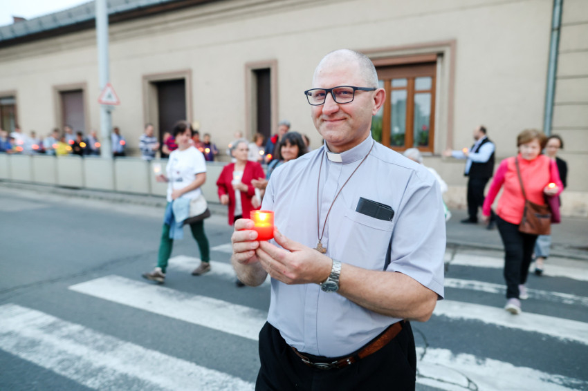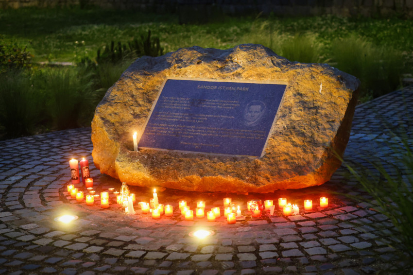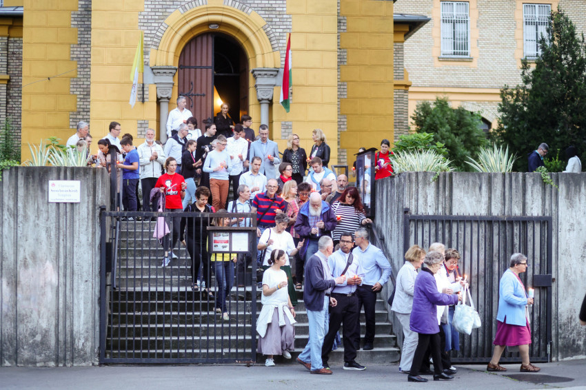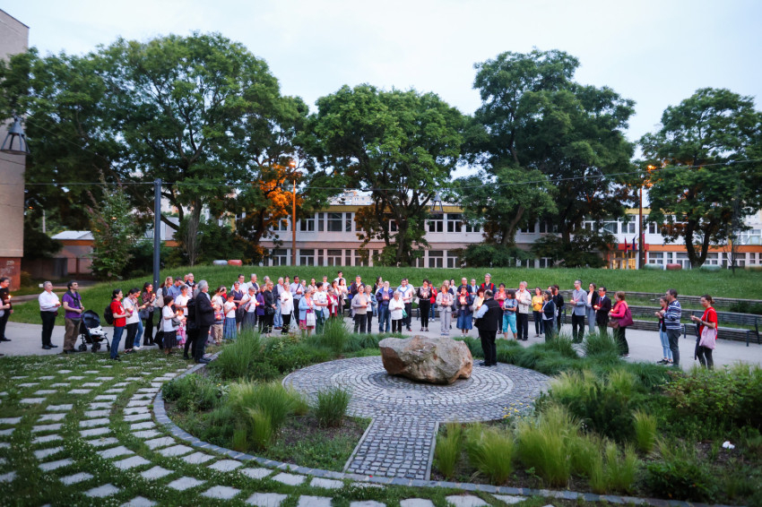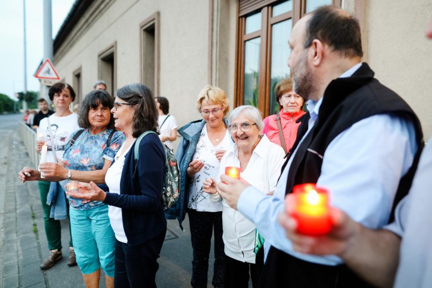 Ezután gyertyás menet indult a közeli Sándor István parkba, tízemeletes lakóházak közé, ahol a közösség imádkozott, majd elénekelte a Te vagy földi éltünk vezércsillaga kezdetű népénekünket és a Szózatot. Ezalatt a hívek gyertyáikat elhelyezték az emlékhely előtt. A templomba visszaindulva felhangzott a Boldogasszony anyánk énekünk.