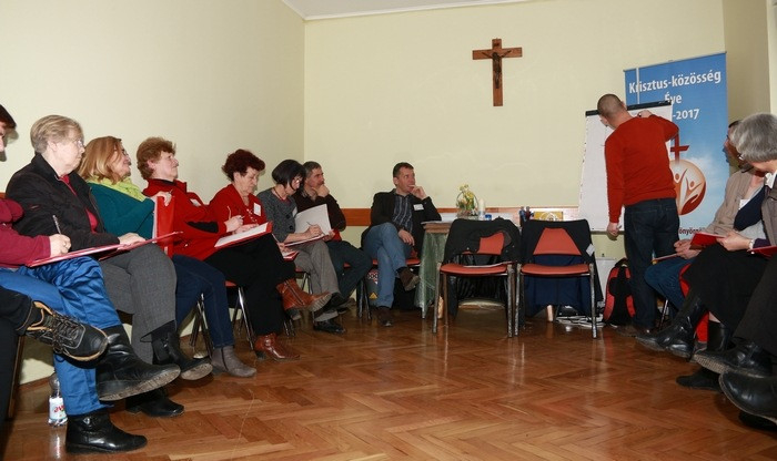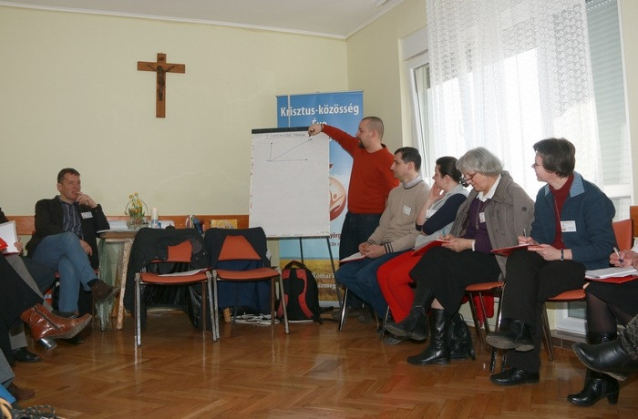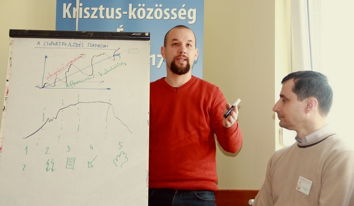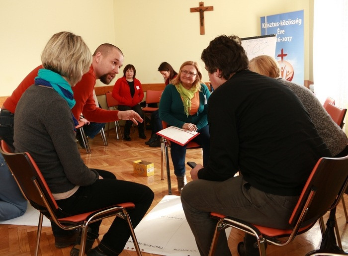 A képzésen részt vevők elhelyezték közösségeiket a folyamatábrán, majd csoportokban beszélték meg helyzetüket, kerestek válaszokat, ötleteket. Értékes tapasztalatok hangzottak el a tagok megszólító bevonzásáról, a kiegyensúlyozott működés Krisztus-központúságáról, a feladatok jó leosztásáról, az arányok megtalálásáról. Szó esett a közösségi buktatókról, az egymásra figyelés fontosságáról, és rámutattak arra, hogy az irányítók mellett a halk szavú tagok felé is ugyanolyan figyelemmel kell fordulni.