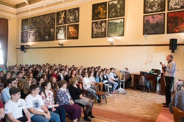 Az iskola dísztermében megrendezett koncerten különböző kvartettekből hallhatott tételeket a diákság: kezdésnek rögtön egy „Finale”-t. A vidám, gyorsabb tempójú szerzeményt egy lassú, andalító tétel követte. A rövid darab olyan benyomást keltett, mint egy ima, amely ugyan szavak nélkül, mégis a szív mélyére hatol. A szerző műveiben letisztultságra törekedett: Haydn erénye éppen az, hogy egyszerű eszközökkel nemes zenét tudott írni, muzsikája ugyanakkor egyszerre naiv, jókedvű és eredeti. Tehetségének köszönheti, hogy Esterházy Pál Antal herceg udvarában kezdetben másodkarnagyként, később mint első karnagy tevékenykedhetett. Nemcsak az udvari zenekart és az operatársulatot vezette, hanem a herceg napi kamarazenélését is ő vezényelte. Sokat kellett komponálnia, hiszen az udvarban hétről hétre új operát adtak elő. Száznégy szimfóniája közül a Búcsúszimfónia és a „csoda” szimfónia (eredeti nevén Mese szimfónia) talán a legismertebbek.