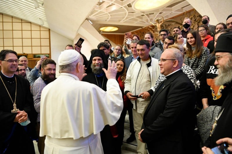 A katekézis közben jött a hír, hogy utána személyesen is találkozhatunk Ferenc pápával. Bennünk, katolikusokban néha megmagyarázhatatlan gyermeki öröm lesz úrrá, amikor élőben láthatjuk a pápát. Protestáns testvéreink számára ez biztosan furcsának tűnhet. Ezért sokat gondolkoztam rajta, hogy keresztyén testvéreim számára milyen érzés lesz találkozni a pápával. A Nemzetközi Eucharisztikus Kongresszuson a Magyarországi Egyházak Ökumenikus Tanácsa olyan szépen köszöntötte Ferenc pápát, hogy reménnyel töltött el az ő hozzáállásuk, és hasonlót tapasztaltam a csoportom részéről: szeretettel és örömmel beszéltek róla, függetlenül attól, hogy sokan nem voltak közülünk katolikusok.