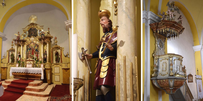 Ma már csak a főszentély boltozatán látható a korábbi kifestések egy részlete: a középkortól fogva helyben tisztelt Szent Lőrinc és Szent István protomártír ábrázolása, mártíromságuk attribútumaival a rostéllyal és kövekkel, valamint kezükben pálmaággal. Felettük felhők angyalokkal kísért dicsőséges Szentháromság fogadja áldozatukat.