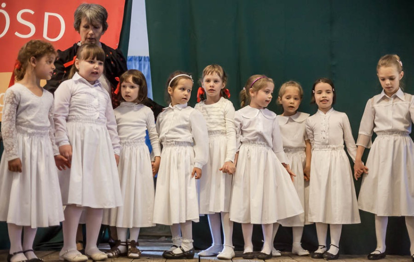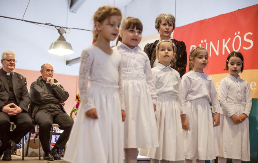 Az egyházmegye iskoláinak tanulói vidám, zenés-táncos pünkösdi műsort adtak elő, felelevenítették többek között a pünkösdölés népszokását is.