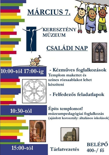 Március első szombatján felnőtteket és gyermekeket egyaránt megszólító családi napra hívja a művészetszeretőket az Esztergom-Budapesti Főegyházmegye fenntartásában működő múzeum. 10–17 óráig kézműves-foglalkozásokat tartanak, amelyek során templommaketteket és színes rózsaablakokat lehet készíteni. Építs templomot! címmel fél 11-től múzeumpedagógiai foglalkozás is várja – főként – az általános iskolásokat. A kicsik felfedezős feladatlapok segítségével is próbára tehetik tudásukat, a felnőttek pedig 15 órai kezdettel tárlatvezetésen vehetnek részt.