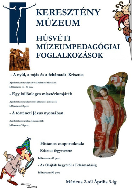 Március 2-a és április 3-a között ötféle húsvétváró múzeumpedagógiai foglalkozáson vehetnek részt gyermekcsoportok előzetes bejelentkezés után. A nyúl, a tojás és a feltámadt Krisztus címmel az alsós általános iskolásoknak, Egy különleges misztériumjáték címmel a felsősöknek, A történeti Jézus nyomában elnevezéssel pedig a gimnazisták számára tartanak élményközpontú programot. További két foglalkozásuk kifejezetten a hittanos csoportokat szólítja meg: a rövidebb Krisztus fegyverzete, a hosszabb Az Olajfák hegyétől a feltámadásig címmel.