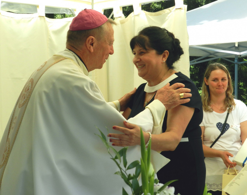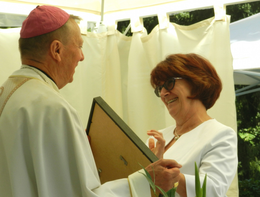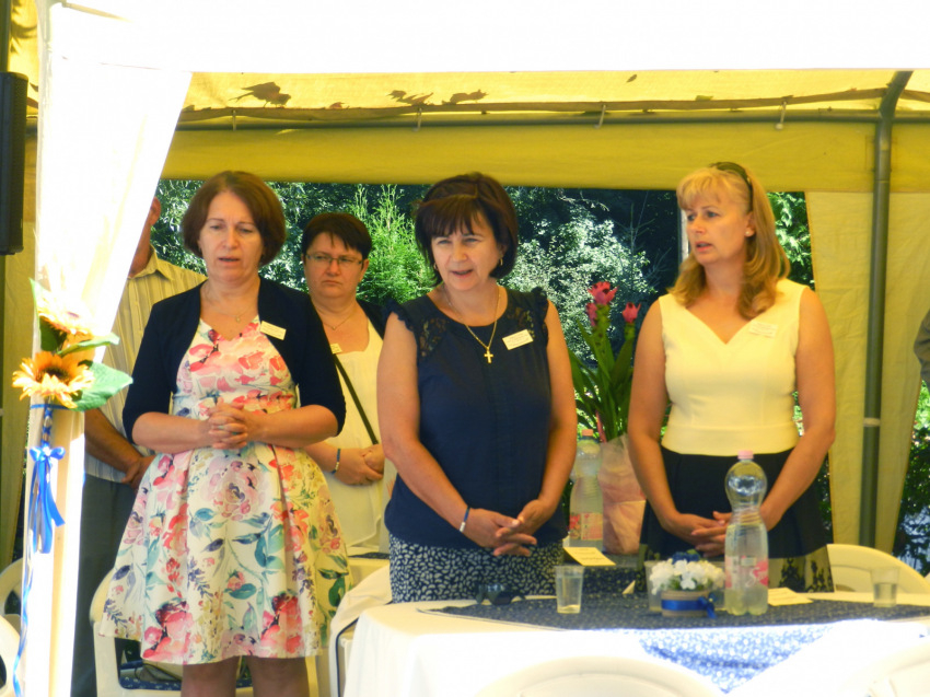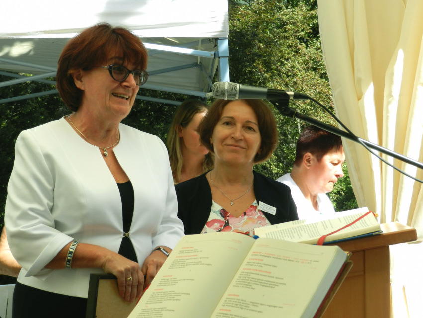 Radnainé Egervári Ágnes főigazgató köszönte meg az intézményvezető és férje szeretetteljes szolgálatát, amelyet az idős lakók érdekében, szinte állandó készenlétben végeztek. „A mai családi napot különlegessé teszi az a tény, hogy tavasszal bejelentetted: leteszed az intézményvezetői feladatot. Így ma, ezen a szép napon nyugdíjba vonulásod okán egy emberöltő, egy egész élet hűséges és kitartó munkáját is méltatjuk” – fogalmazott a főigazgató, és rávilágított: „Hordozói vagyunk testvéreinknek.” Felidézte Székely János püspök szavait, aki egy történetet mondott el a szeretetszolgálat alapításának hatvanötödik jubileumán. Egy kilencéves gyermek, valahol Dél-Amerikában egy másik kisgyermekkel a hátán, izzadva kaptatott felfelé a hegyen. Egy amerikai turista kérdésére, nem nehéz-e neki ez a teher, megdöbbenve válaszolt: »Nem teher ő, hanem a testvérem!«”