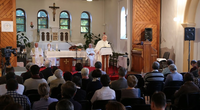 A Magyar Katolikus Családegyesület szervezte összejövetelt szentmise zárta, melyet Bíró László püspök a résztvevő paptestvérekkel, köztük Szabó Ferenc SJ atyával mutatott be. Bíró László a bátorítás, buzdítás hangján szólt szentbeszédében a résztvevőhöz. Az örvendező Máriát, a „boldogság asszonyát” állította példaképül a résztvevők elé, és Ferenc pápához kapcsolódva arra buzdított, hogy mi is legyünk a remény emberei, örvendező keresztények. Mi ad okot az örömre? – tette fel a kérdést. Megszületett az, akit évszázadok vártunk, megérkezett az Úr – ez Mária örömének oka, és ez a keresztény ember biztos reménye. Ő az Úr, és ő Emmánuel – mondta Bíró László. Nemcsak az érkező, hanem a velünk lévő Isten. Ezt az örömünket senki nem veheti el, ezt minden felszíni küzdelem ellenére tudnunk kell – figyelmeztetett a püspök. Ugyanakkor rámutatott: Mária öröme tartós, belső öröm. Ezt hívja nyelvünk boldogságnak. Soha nem szabad elfeledni, hogy a belső öröm adja meg a boldogságot.