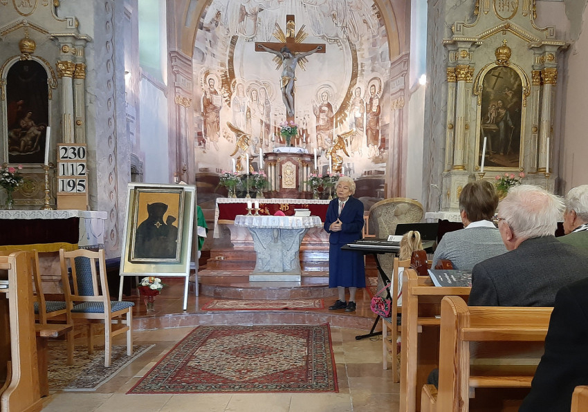 Prokopp Mária művészettörténész előadásban ismertette a pilisszentkereszti templom művészettörténeti értékeit, részletesebben is szólt a most megáldott Pálos Madonna-kegyképről.