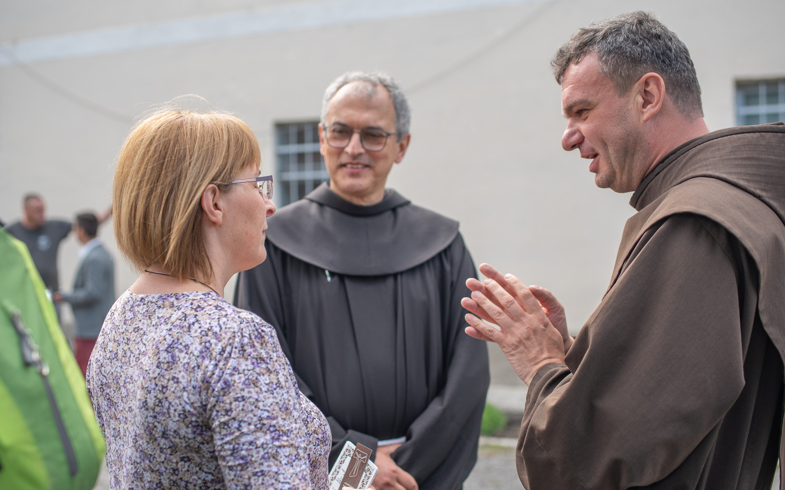 Massimo Fusarelli és Albert Schmucki definitor generális vasárnap délután négy órakor a Ferences Nagycsalád tagjaival találkozott a csíksomlyói kolostor udvarán.