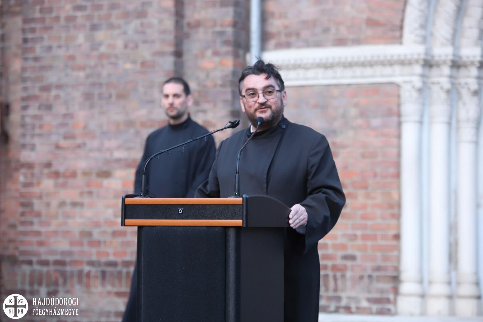 Kapin István parókus köszöntötte a résztvevőket a debreceni Attila téri főszékesegyház előtt.