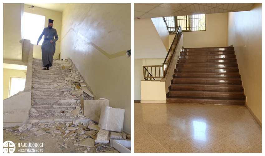 Csodálatos volt látni a 2500 ott tanuló kis- és nagydiákot. A néhány éve még ürességtől kongó romhalmaz ma makulátlan tisztaságú, csillogó, virágzó iskolaközpont, teli élettel, gyerekzsivajjal. A falakon golyónyomok helyett ikonok, feszületek és Ferenc pápa képei láthatók, a fegyverraktár ma ismét kápolna.